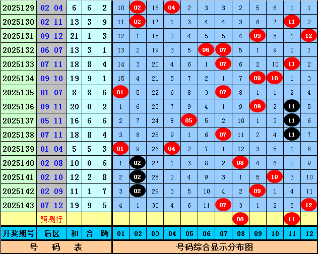 三少第2025144期体彩大乐透后区尾数分析:上期后区开出奖号07和12,奖号尾数为1路和2路,本期后区排除0路尾数号码,五码参考02、07、08、11、12。