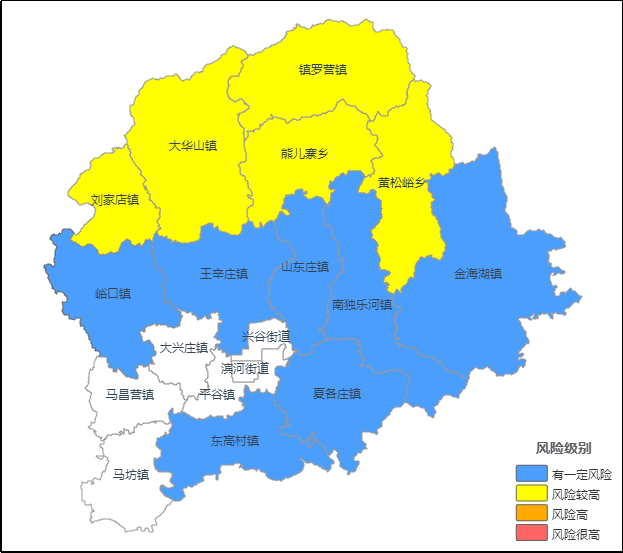 8月18日20时至8月19日20时,平谷区镇罗营镇、大华山镇、刘家店镇、熊儿寨乡、黄松峪乡发生滑坡、崩塌、泥石流等地质灾害的风险较高(黄色预警),峪口镇、王辛庄镇、山东庄镇、南独乐河镇、金海湖镇、夏各庄镇、东高村镇有发生滑坡、崩塌、泥石流等地质灾害的风险(蓝色预警),请注意防范。