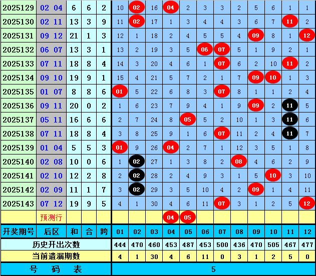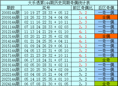 后区分析:在第144期历史同期开奖中,后区奖号奇偶比为16:16,最近5年同期后区奇偶走势为:一奇一偶、一奇一偶、一奇一偶、一奇一偶、全奇,今年同期预计奇偶号码同出,关注两码04、05。