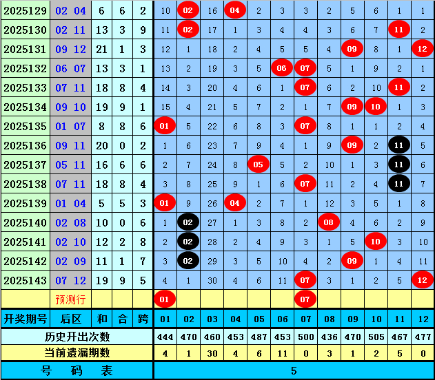 后区分析(定义:01-04为一区,05-08为二区,09-12为三区):上期后区开出奖号07和12,分别出现在第二区和第三区和区,最近10期后区三个区间落号个数比为6:5:9,本期后区注意第一区和第二区号码出现,关注两码01、07。